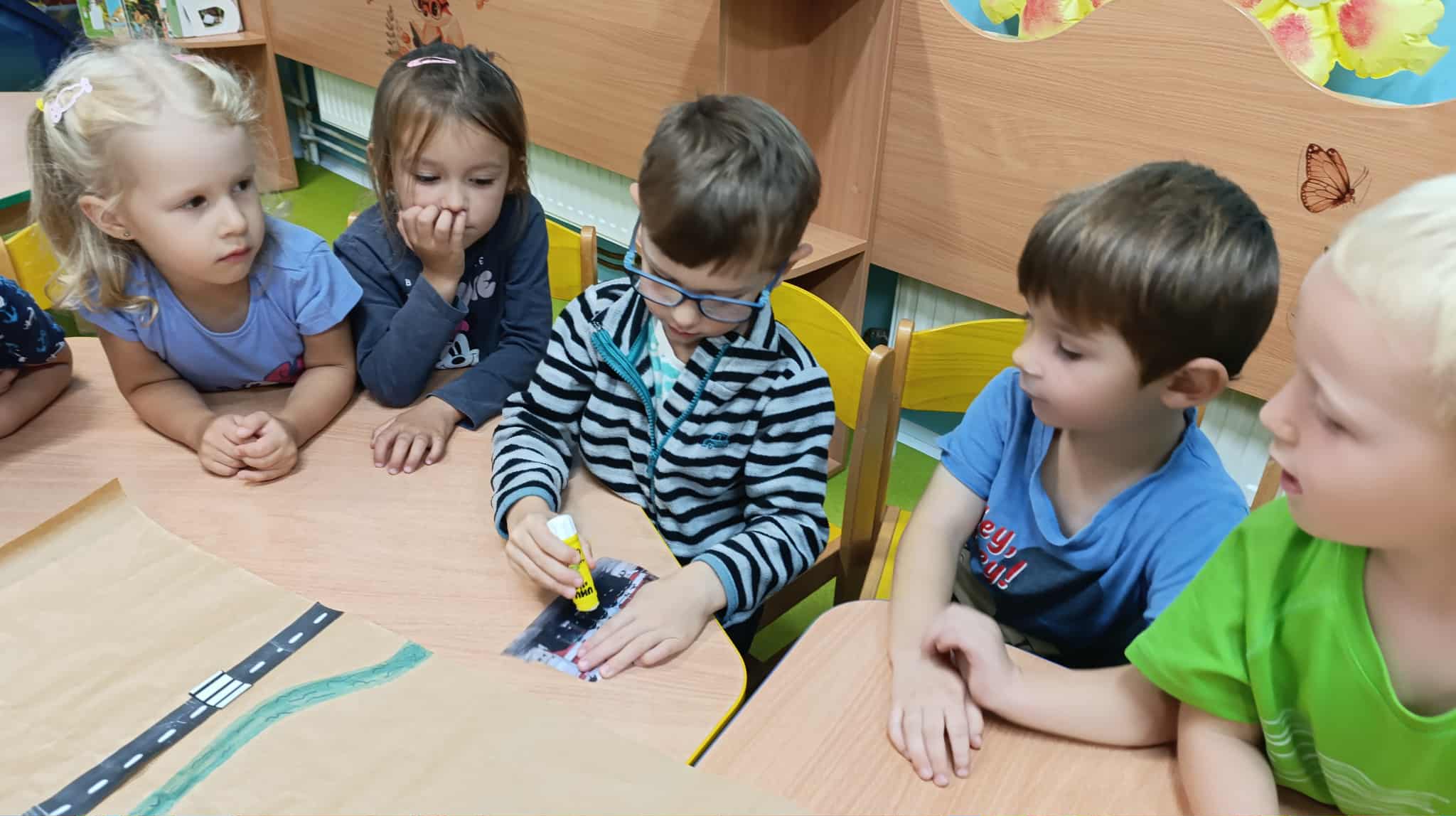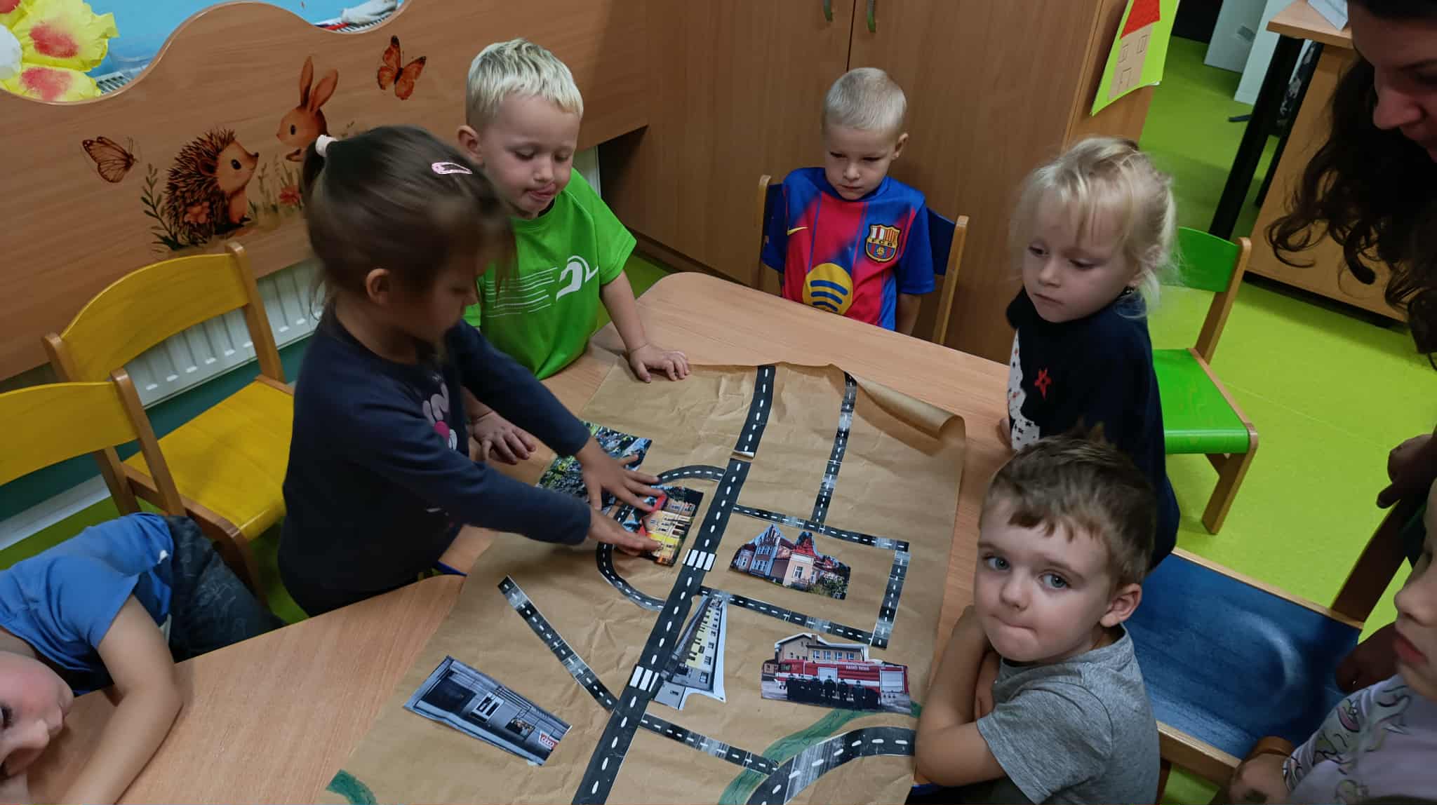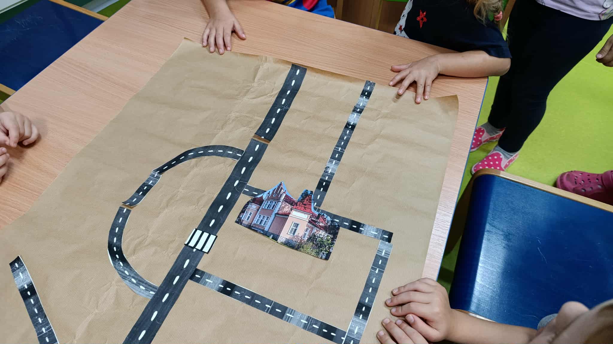 Po návratu do školky na děti čekala práce s mapou. Nejprve děti na obrázcích poznávaly budovy, které již znaly z procházky. Tyto budovy vystřihly a společně se musely rozhodnout, kam je nalepit. Tento úkol nebyl úplně snadný, ale děti ho zvládly výborně. Do mapy poté pastelkami dokreslovaly další budovy a okolí.