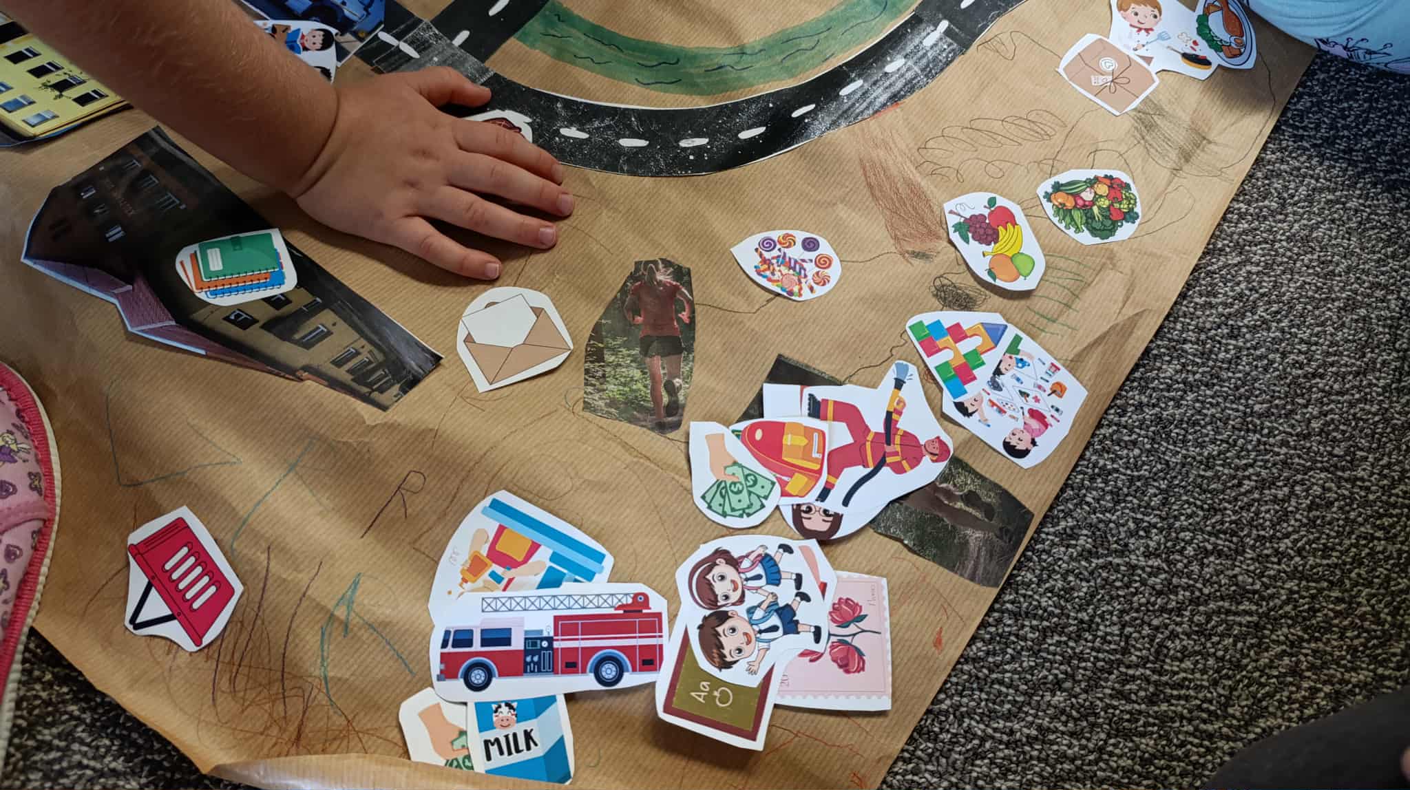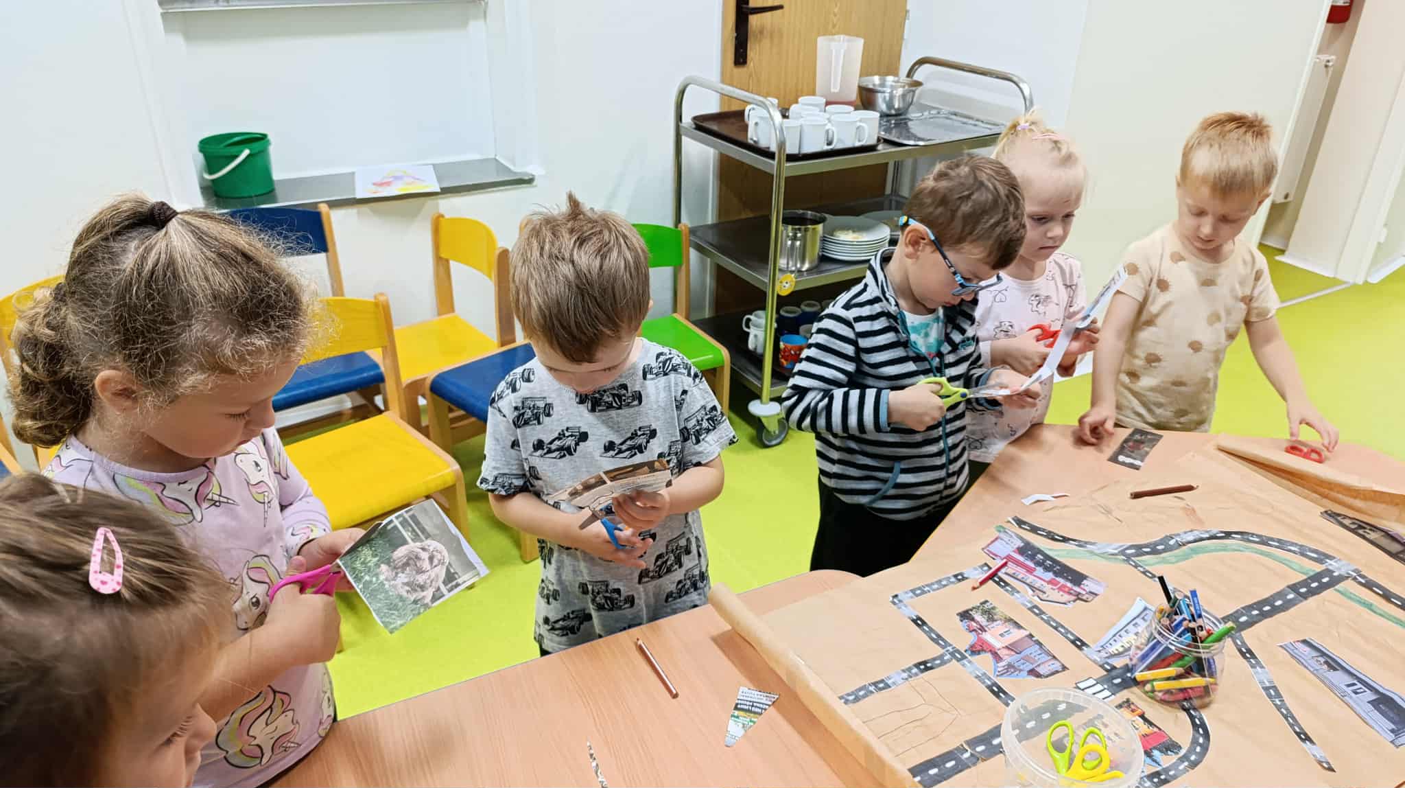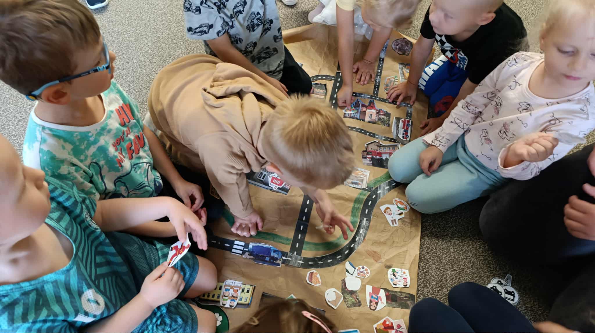 Po návratu do školky na děti čekala práce s mapou. Nejprve děti na obrázcích poznávaly budovy, které již znaly z procházky. Tyto budovy vystřihly a společně se musely rozhodnout, kam je nalepit. Tento úkol nebyl úplně snadný, ale děti ho zvládly výborně. Do mapy poté pastelkami dokreslovaly další budovy a okolí.