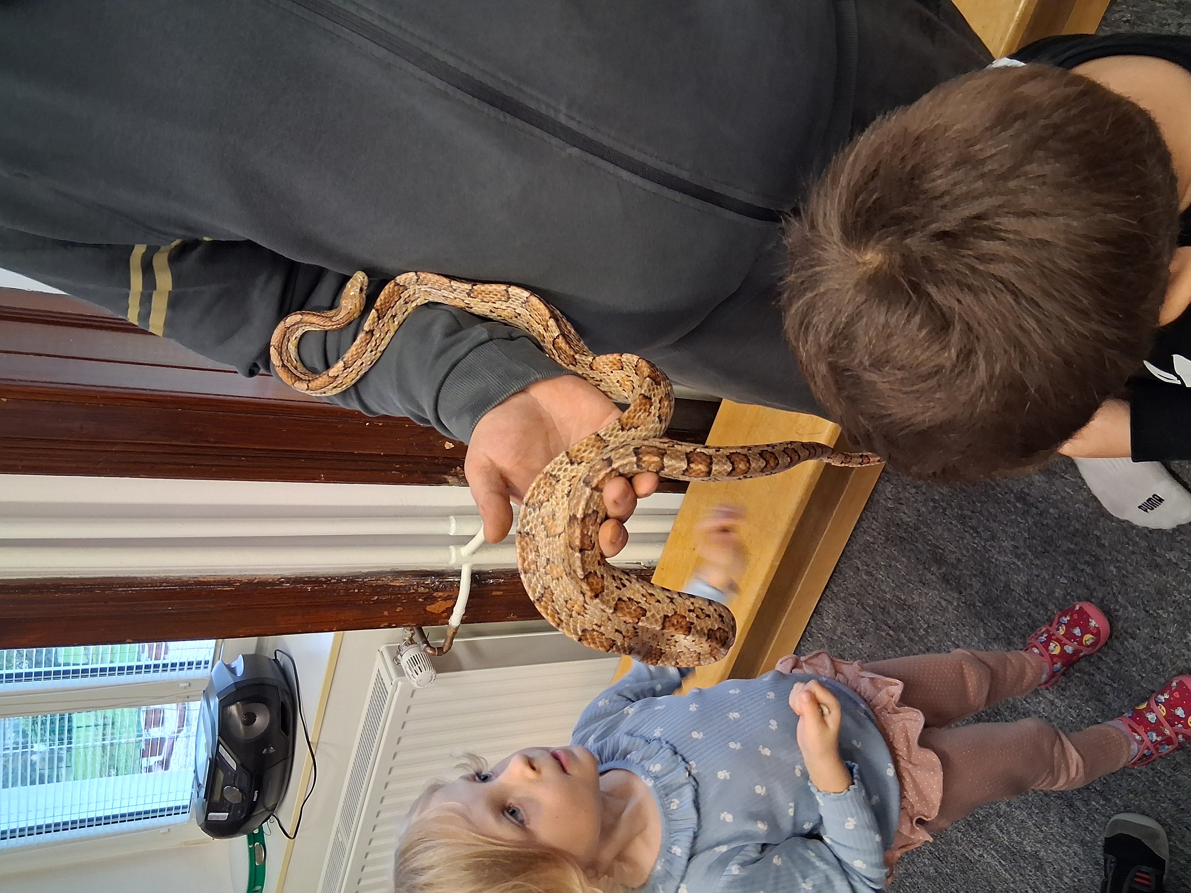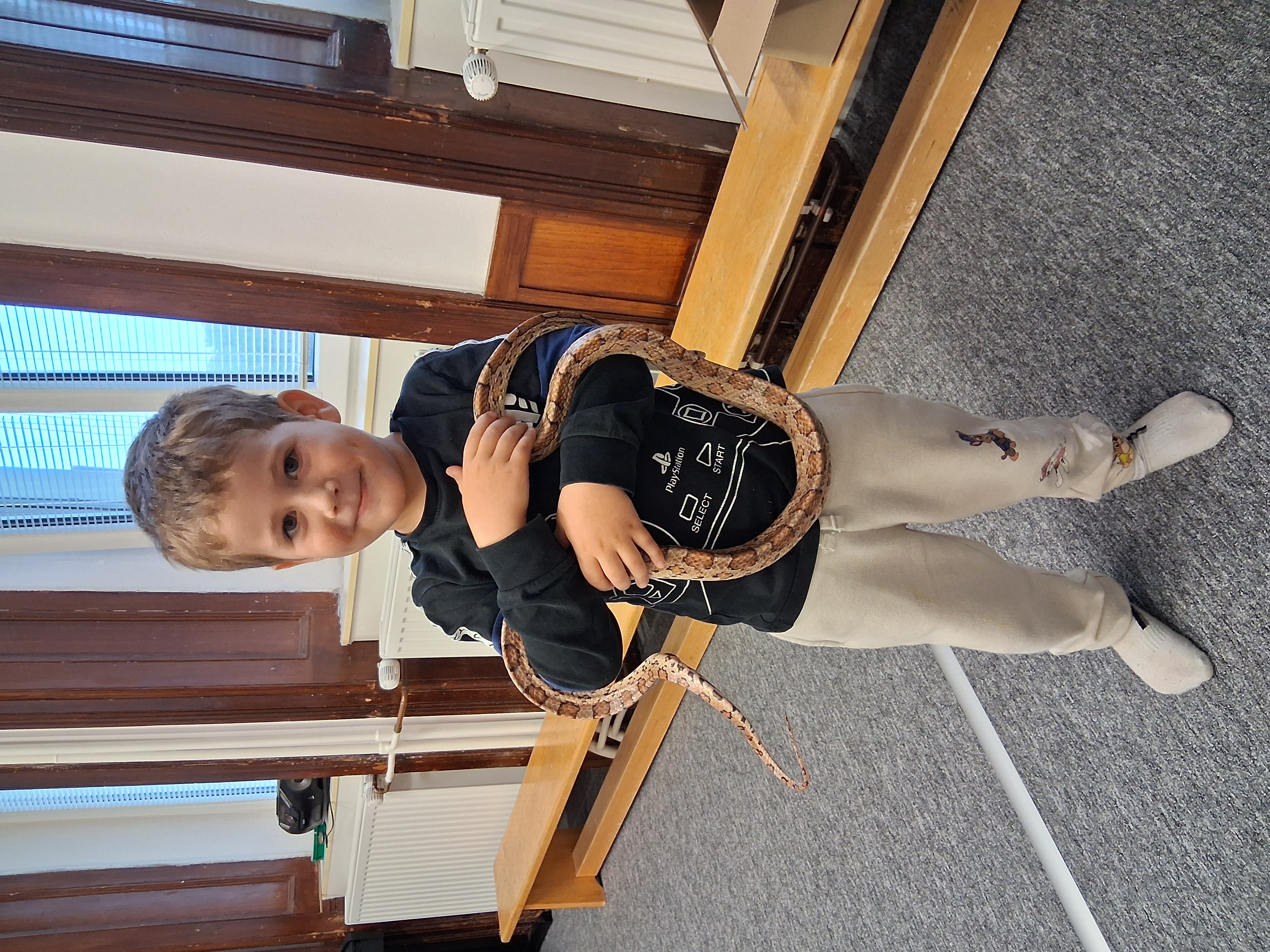 O velké překvapení se postaral tatínek jednoho z dětí, který nám přišel ukázat hada. Děti si ho mohly zblízka prohlédnout a dozvěděly se mnoho zajímavostí o tom, jak had žije a čím se živí. A protože nás zvířecí návštěvy moc bavily, druhý den k nám zavítal i malý křeček, který si okamžitě získal všechny dětské sympatie.