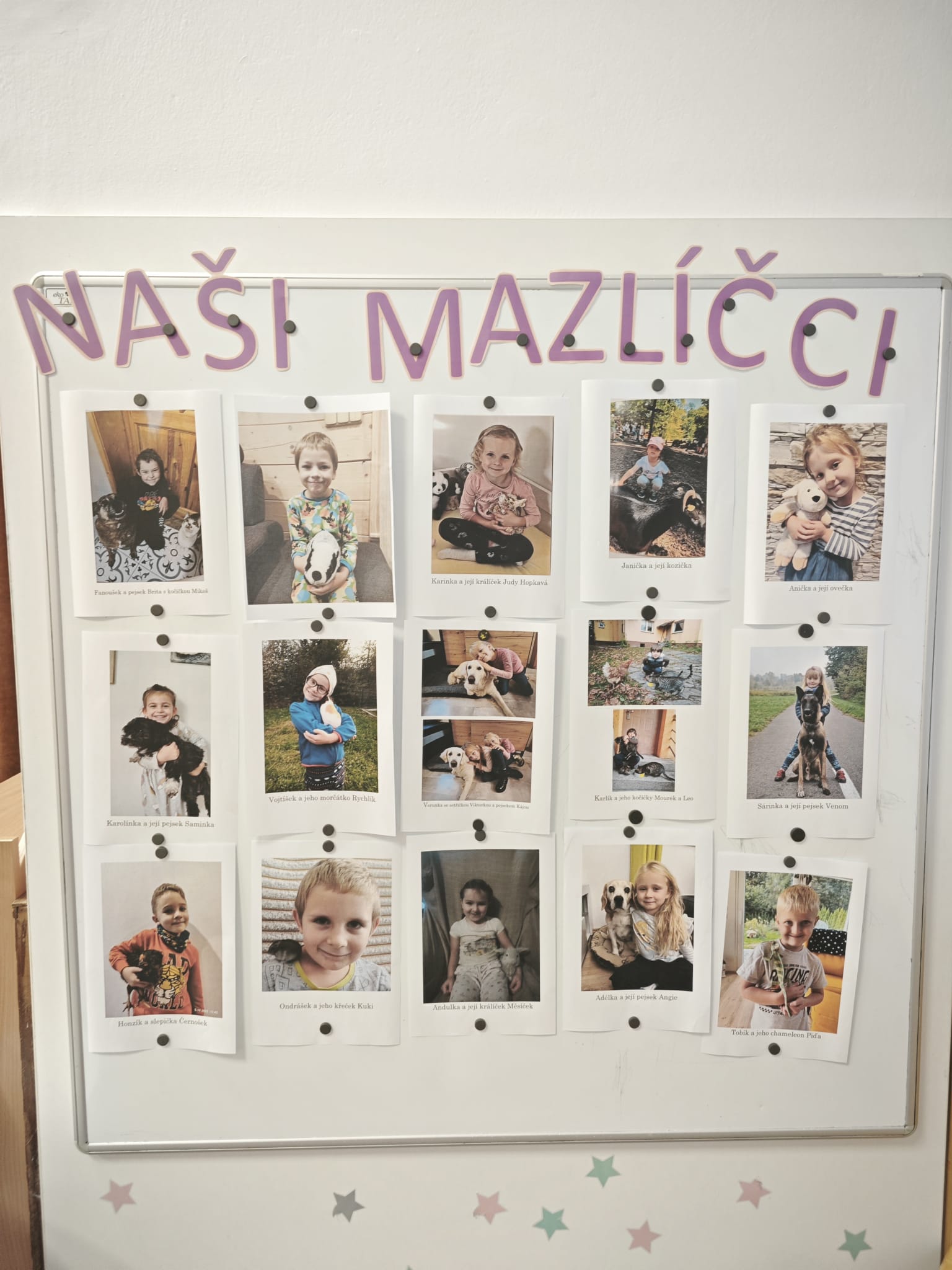 Děti si přinesly fotografie sebe a svých mazlíčků a s velkým zaujetím o nich vyprávěly. Sdílely, jak se o ně starají, co mají jejich zvířátka ráda i jaké s nimi zažívají veselé příhody. Dozvěděli jsme se, kdo má doma pejska, kočičku, křečka, morče, ovečku, slepičku, nebo třeba hada.