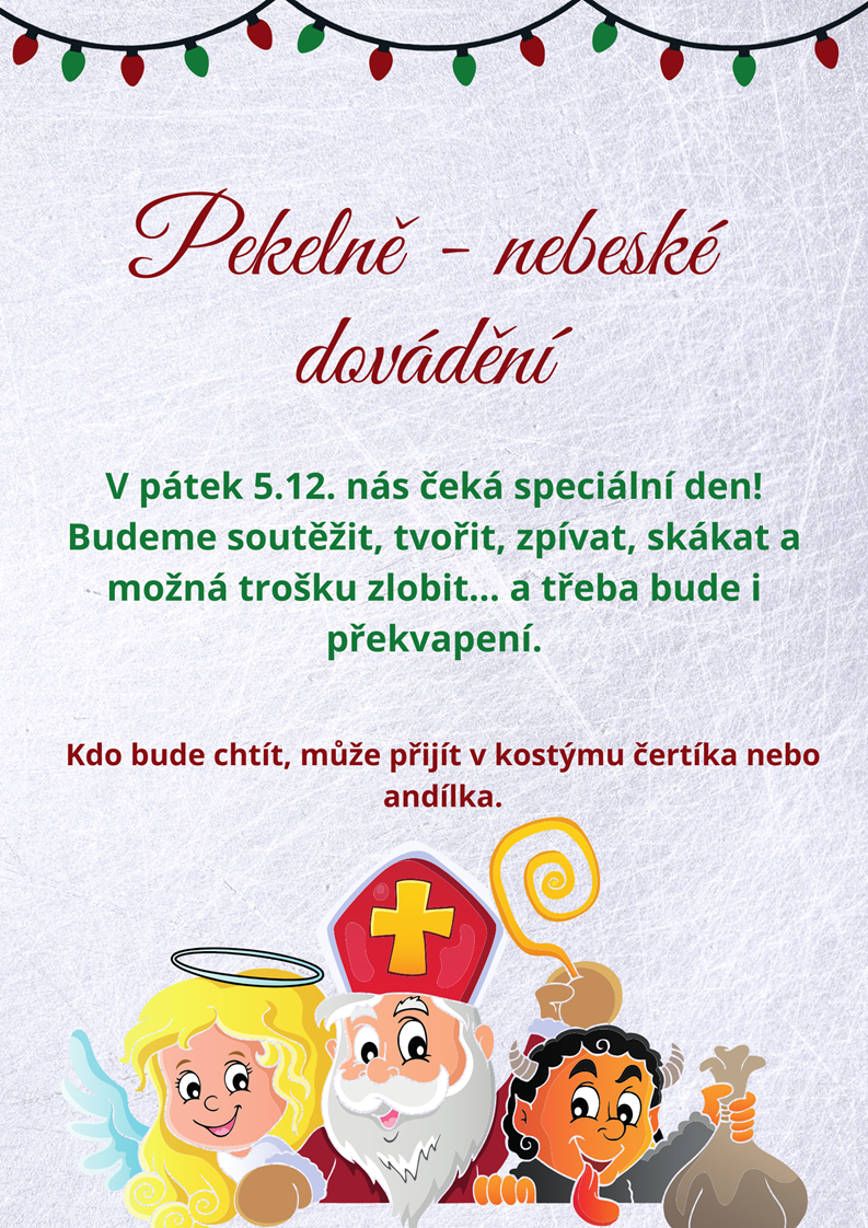 Každá třída měla připravený vlastní mikulášský program. Děti si povídaly o tradicích spojených se svátkem svatého Mikuláše, zpívaly písničky a plnily různé hravé úkoly. Nechybělo ani tematické tvoření – vznikali čertíci, andílci i Mikulášové, kteří pak zdobili naše třídy a šatny.