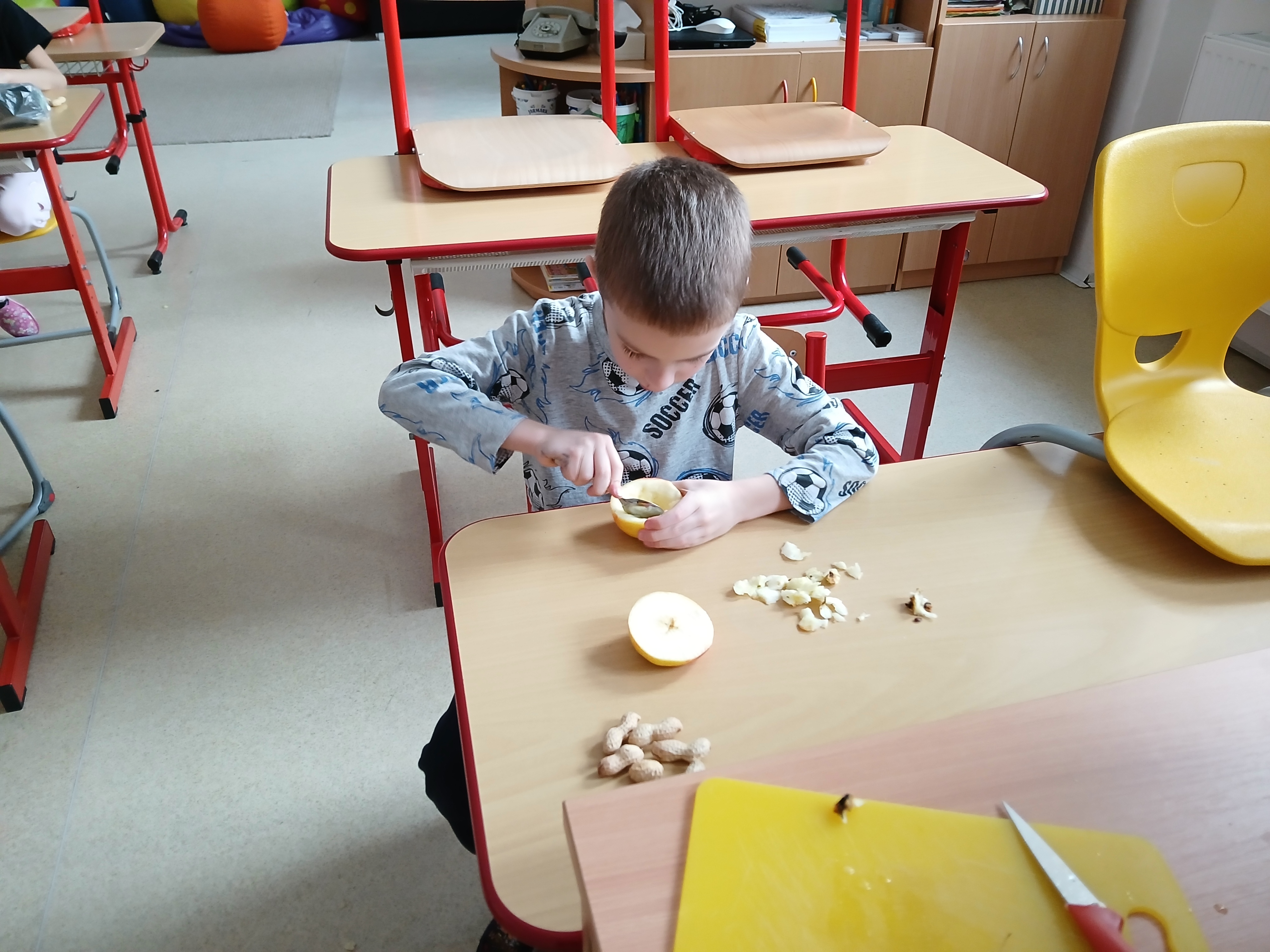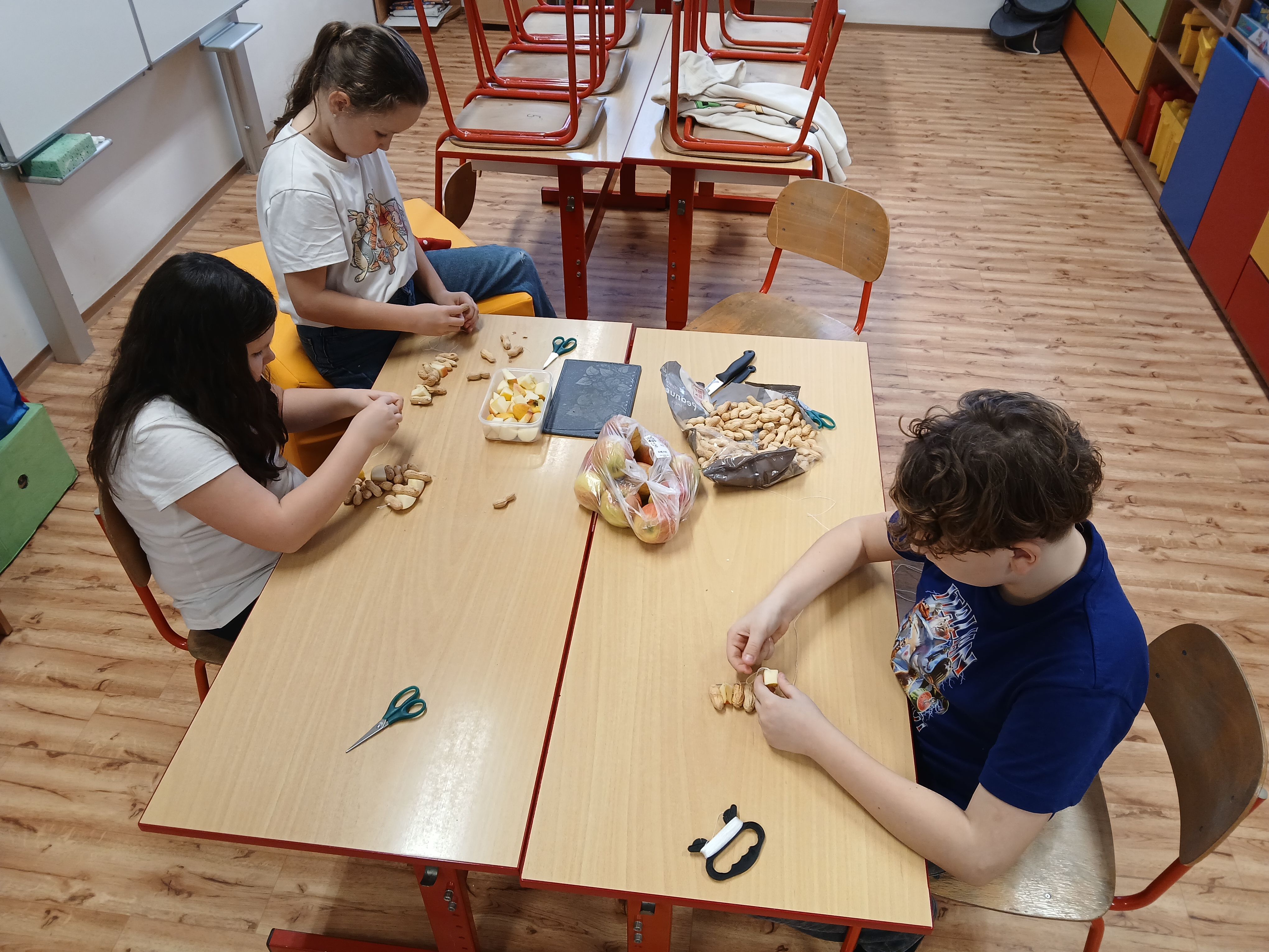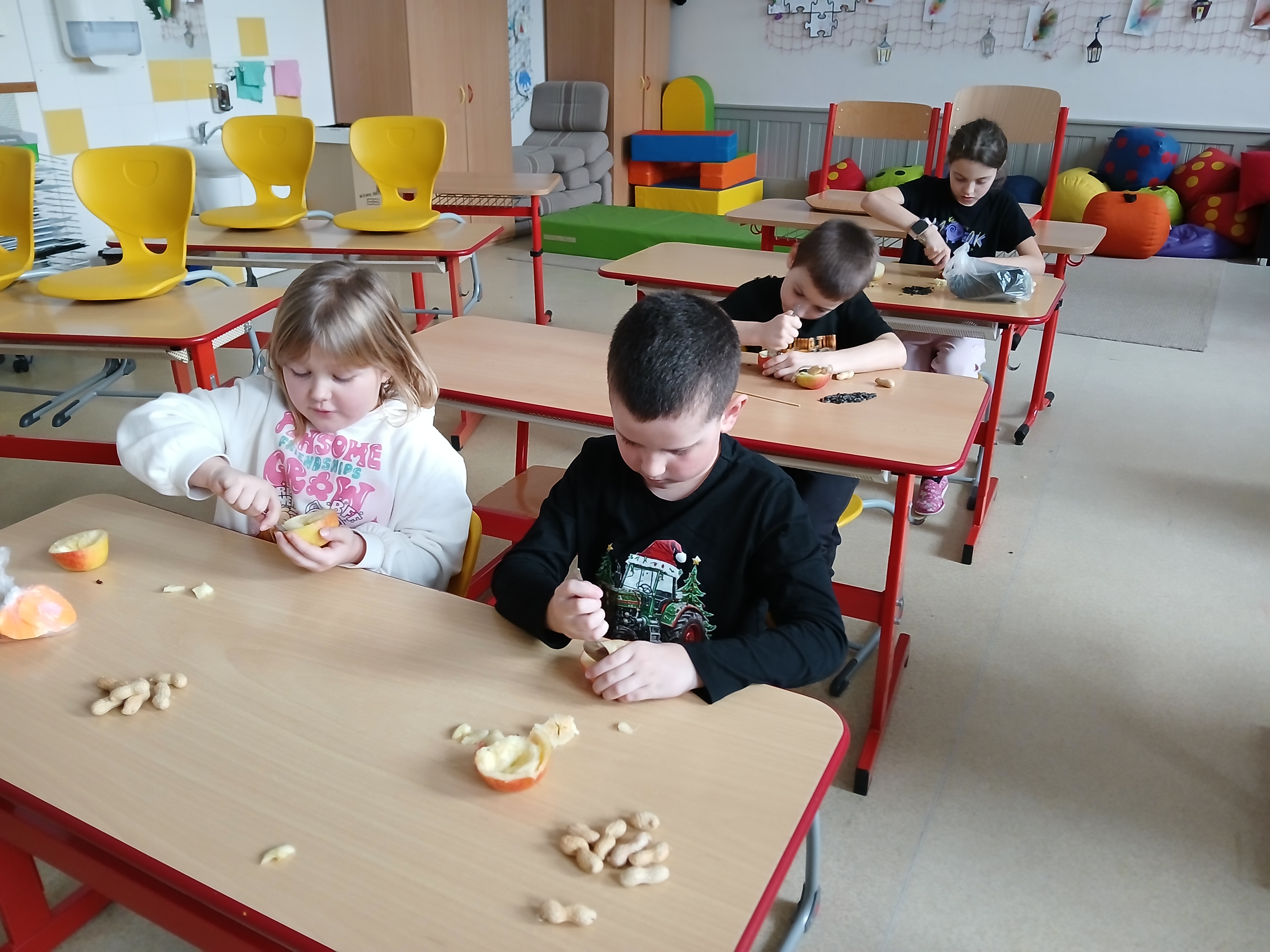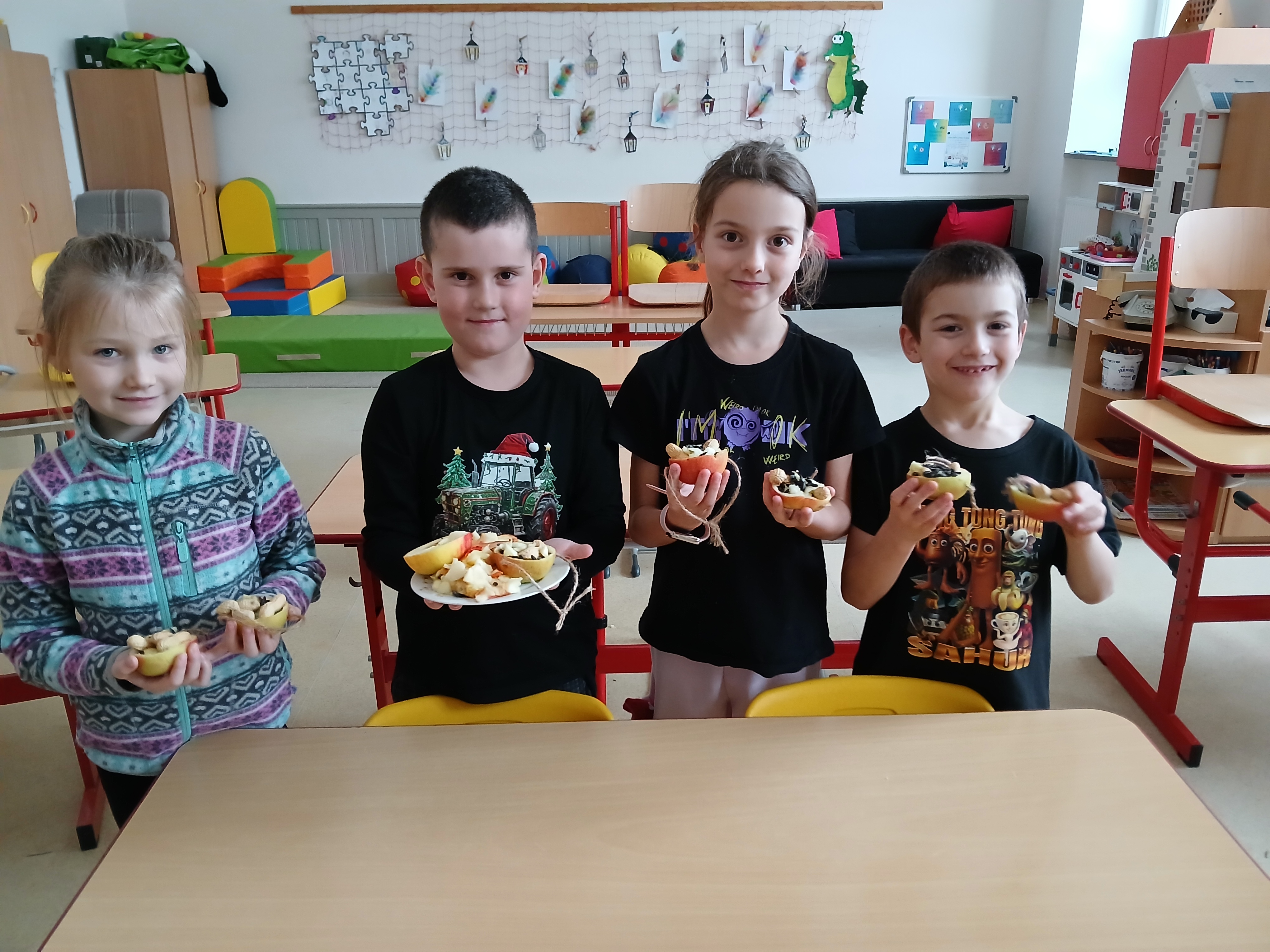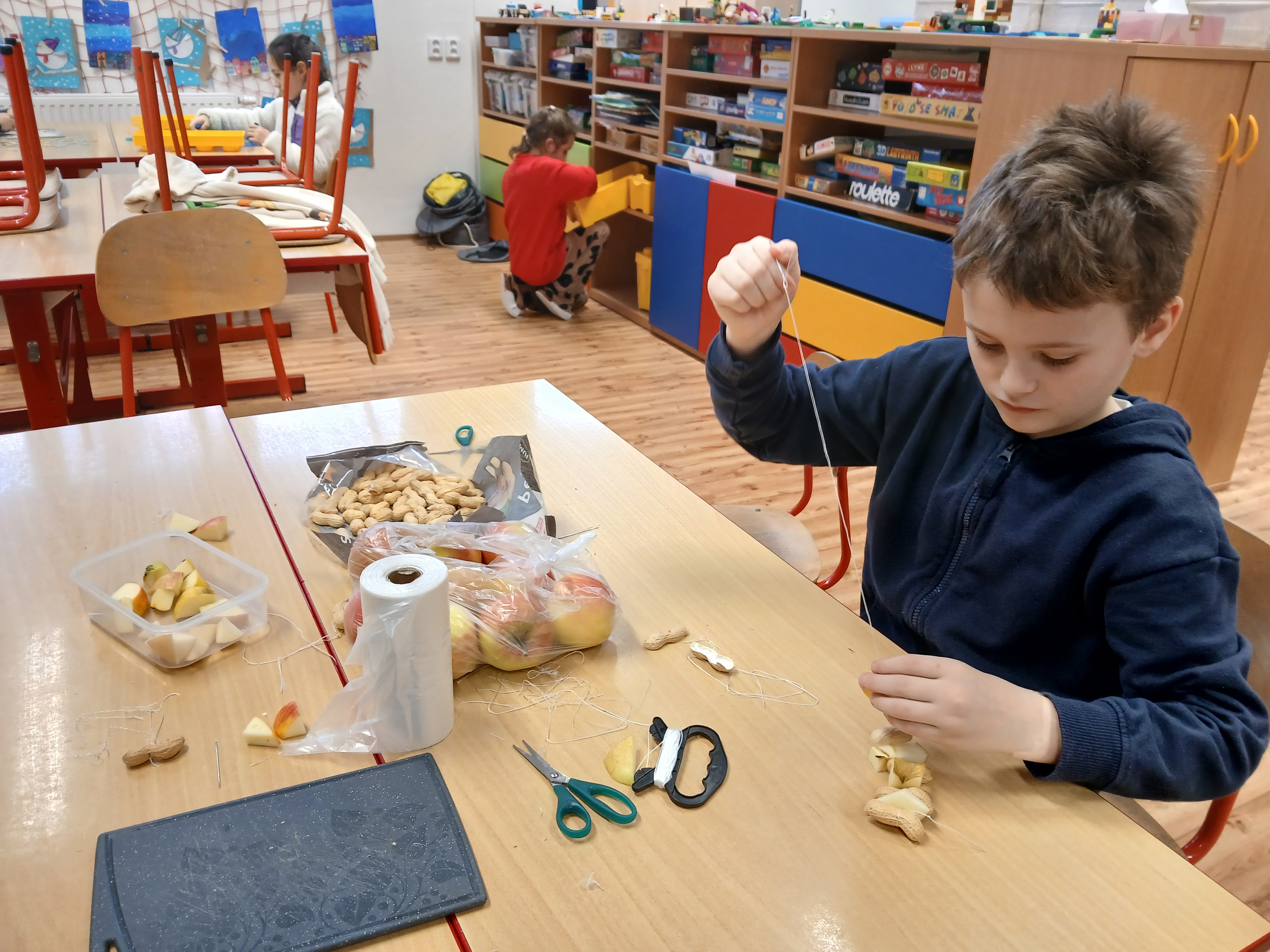 Společně jsme vydlabali jablka a pomeranče. Do vyhloubených plodů jsme přidali semínka – slunečnicová a řepková. Takto připravená krmítka jsme poté zavěsili na větve stromu před školou.