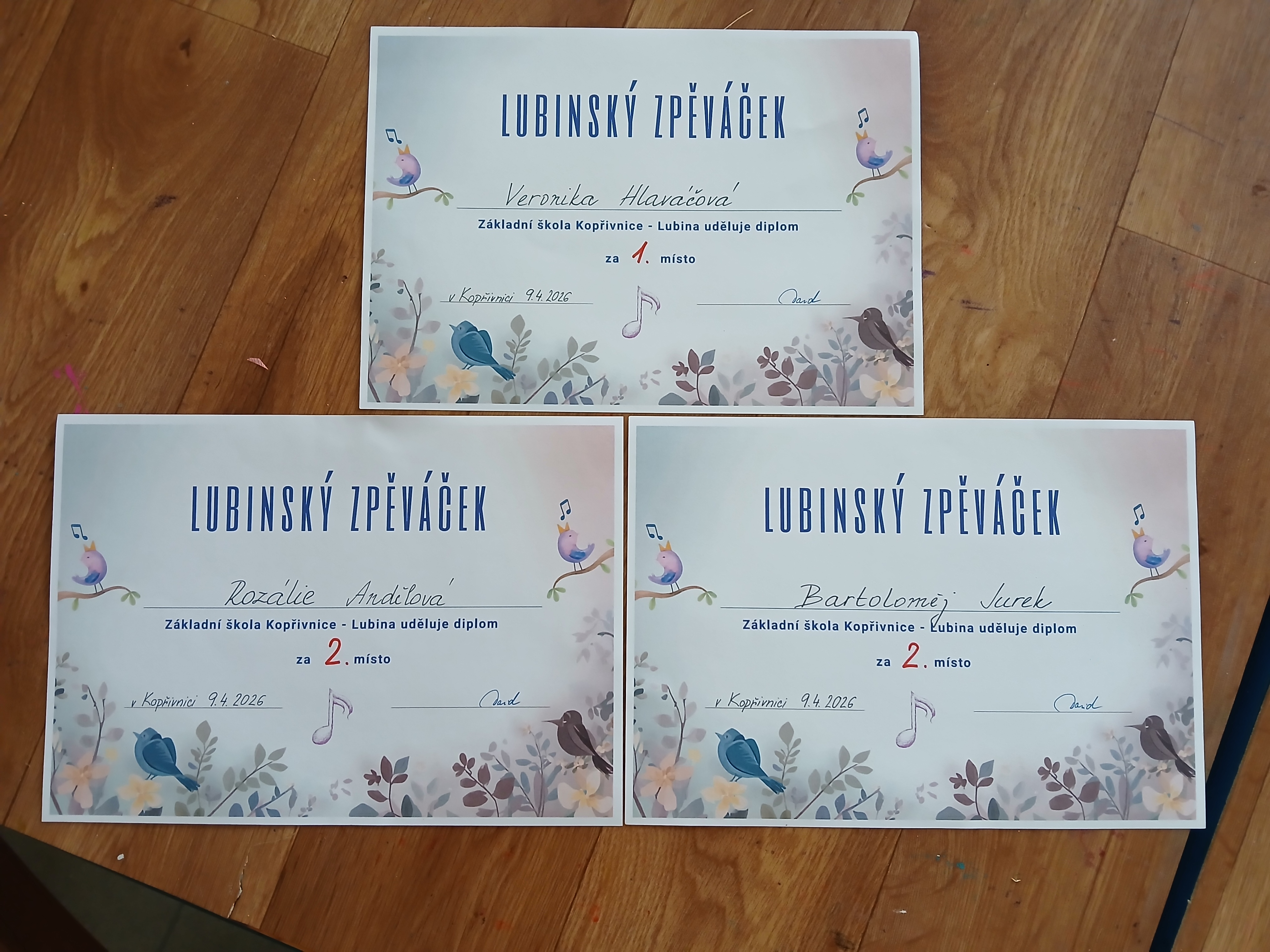 Reprezentovali ji Anežka Pavlisková, Stela Fajčáková, Rozálie Andělová, Bartoloměj Jurek a Veronika Hlaváčová. Z DDM Kopřivnice jsme si odvezli dvě druhá místa, která získala Rozárka v kategorii 3.tříd a Bart v kategorii 4. tříd. Veronika Hlaváčová vyhrála 1. místo v kategorii nejstarších.