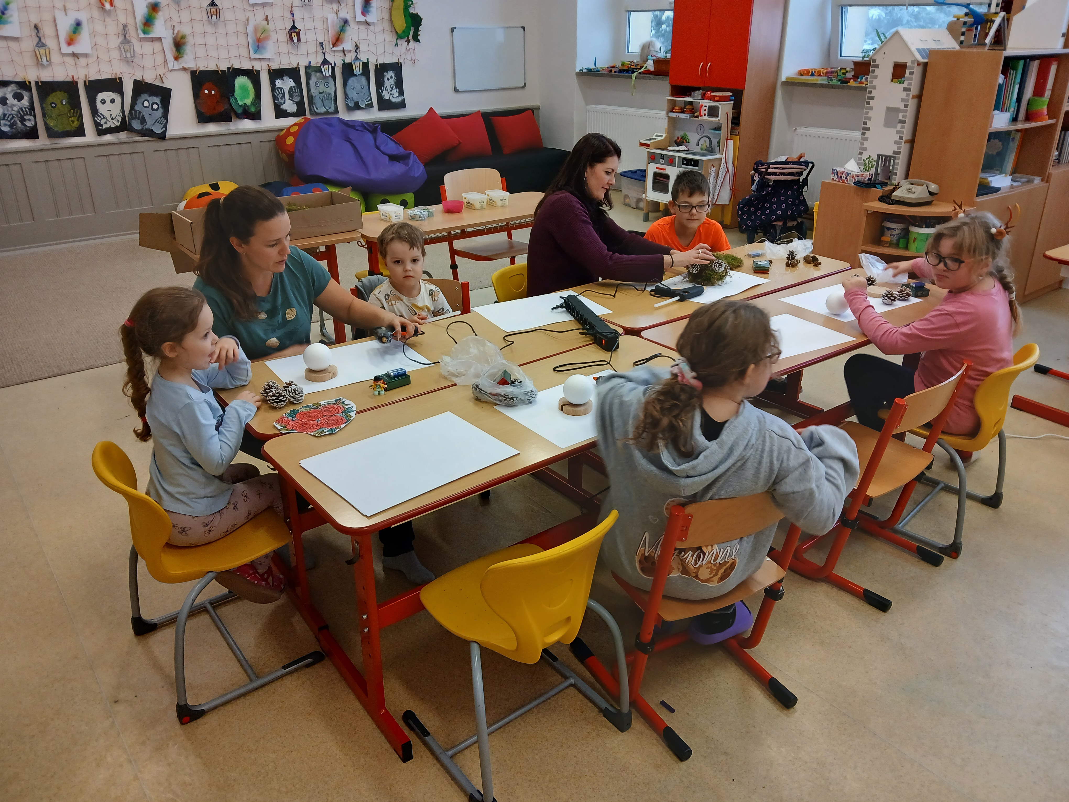 Na tvoření dorazily maminky, babičky a dva tatínci. Odpoledne se vydařilo a děti měly radost, že mohly tvořit společně se svými blízkými. Vzniklo mnoho krásných výrobků a všichni si užili příjemné chvíle v duchu nadcházejících Vánoc.