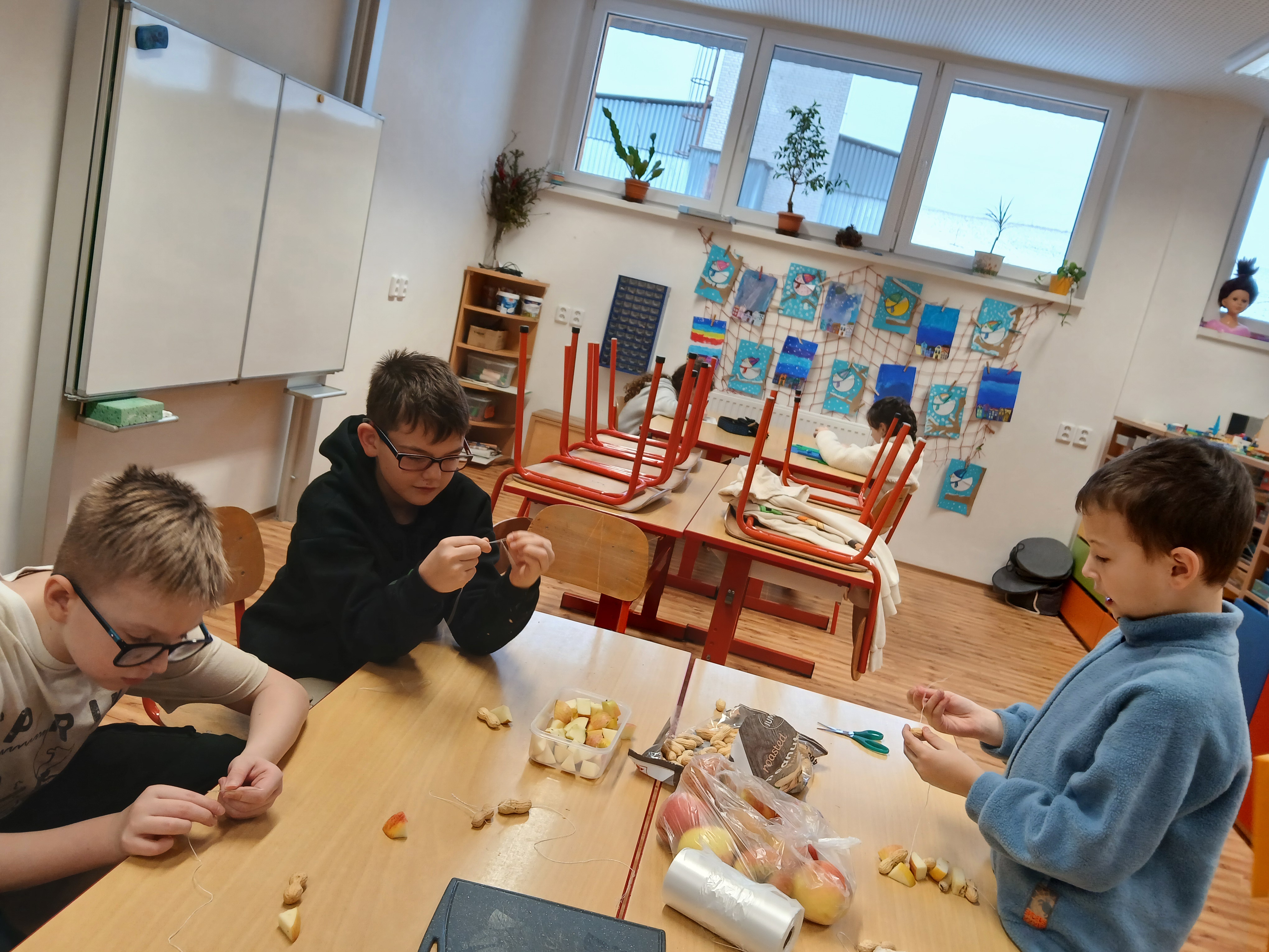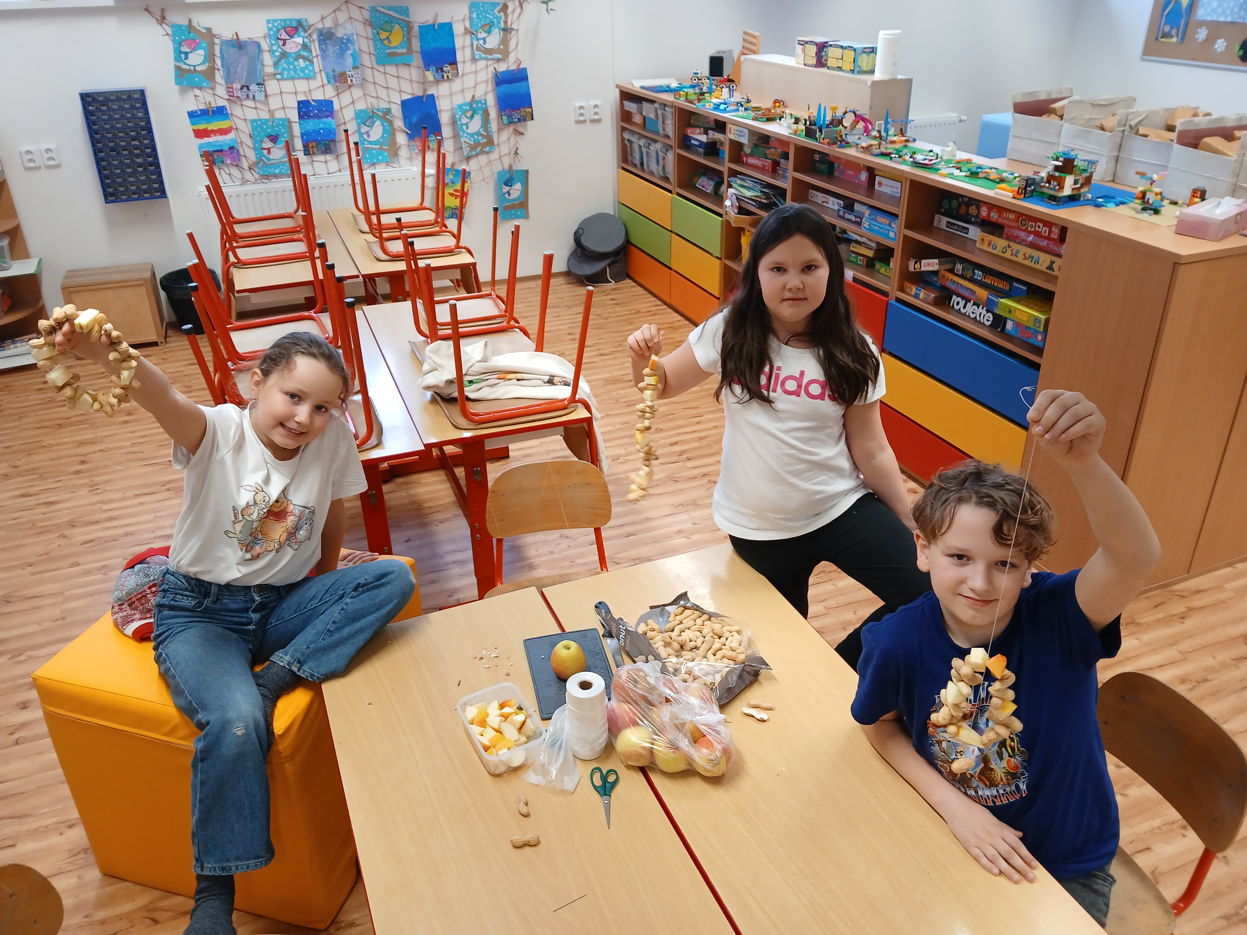 Společně jsme vydlabali jablka a pomeranče. Do vyhloubených plodů jsme přidali semínka – slunečnicová a řepková. Takto připravená krmítka jsme poté zavěsili na větve stromu před školou.