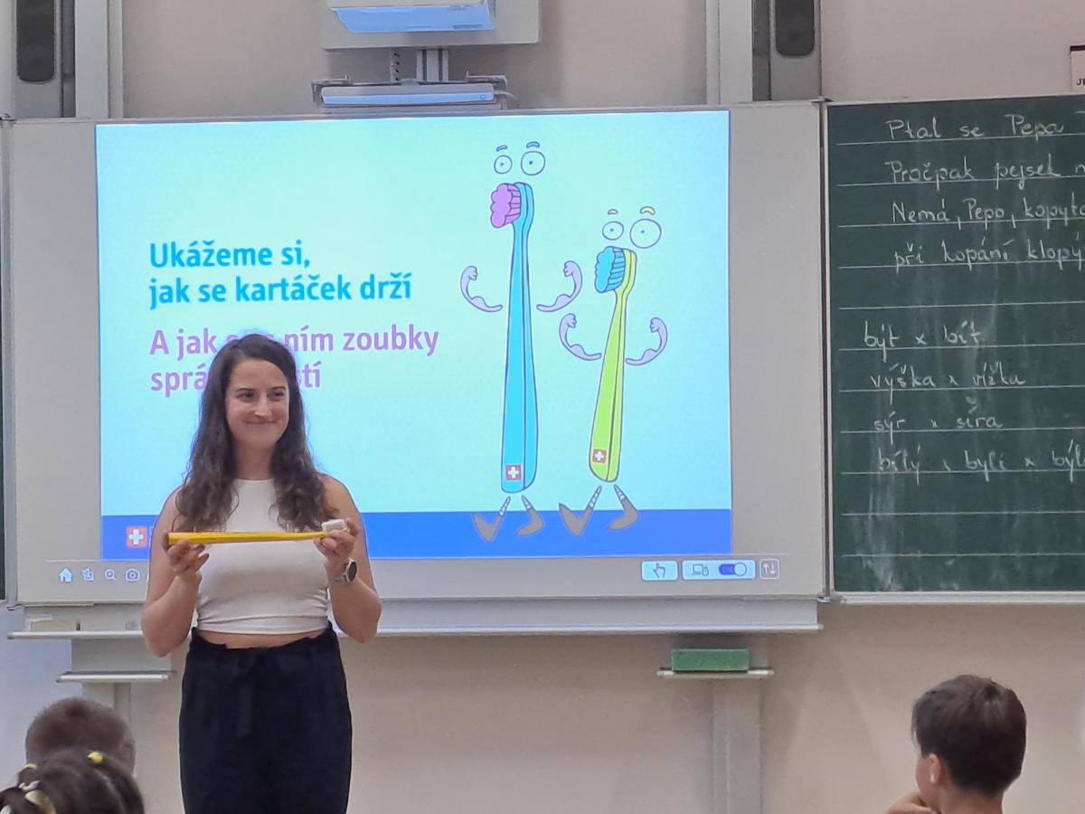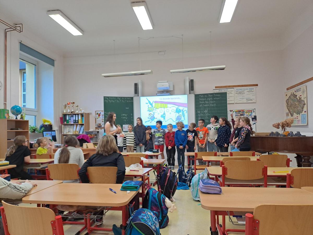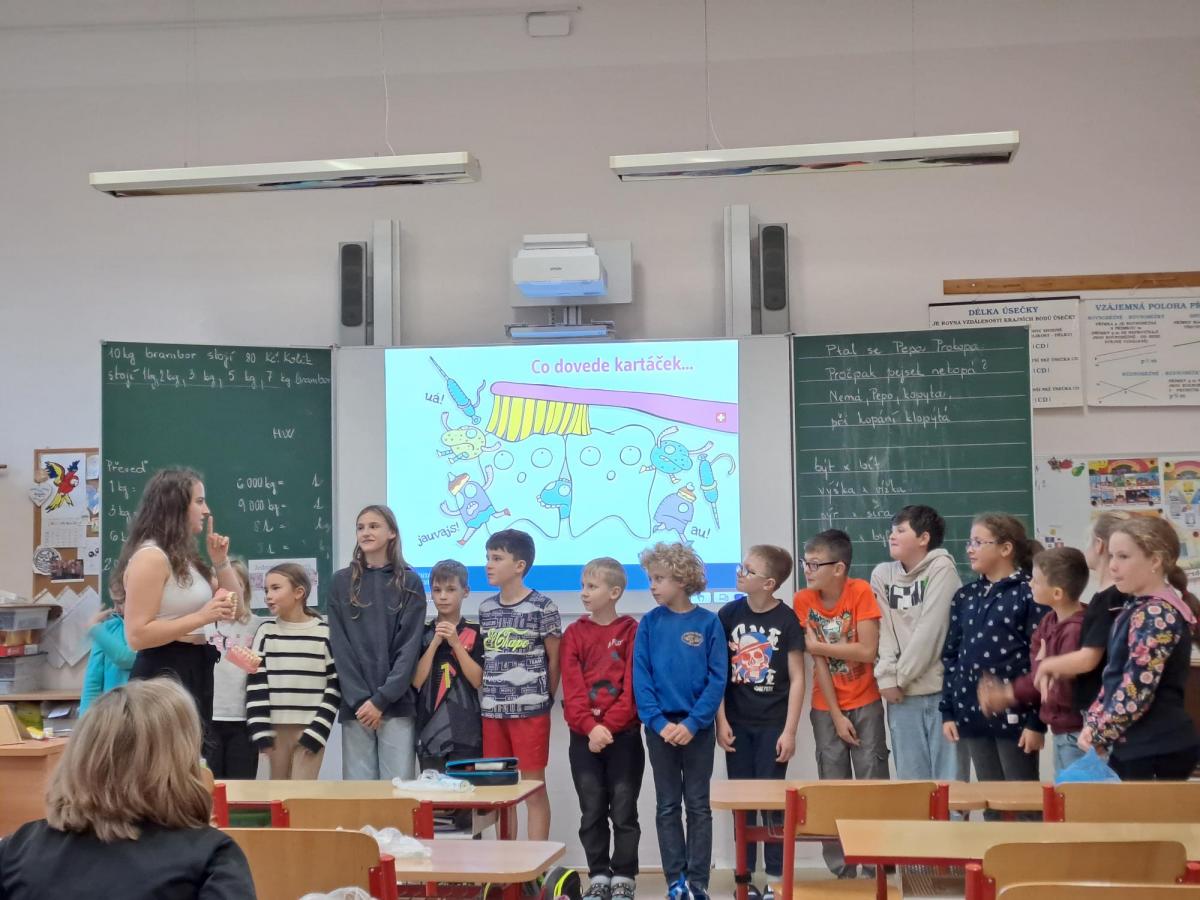 Studentka zubní medicíny slečna Krpcová dětem poutavě vysvětlila rozdíl mezi mléčným a trvalým chrupem, popsala stavbu zubu a objasnila, proč je důležité pečovat o zuby pravidelně a správně. Žáci se dozvěděli, jak vzniká zubní kaz a jak mu lze předcházet vhodnou hygienou.