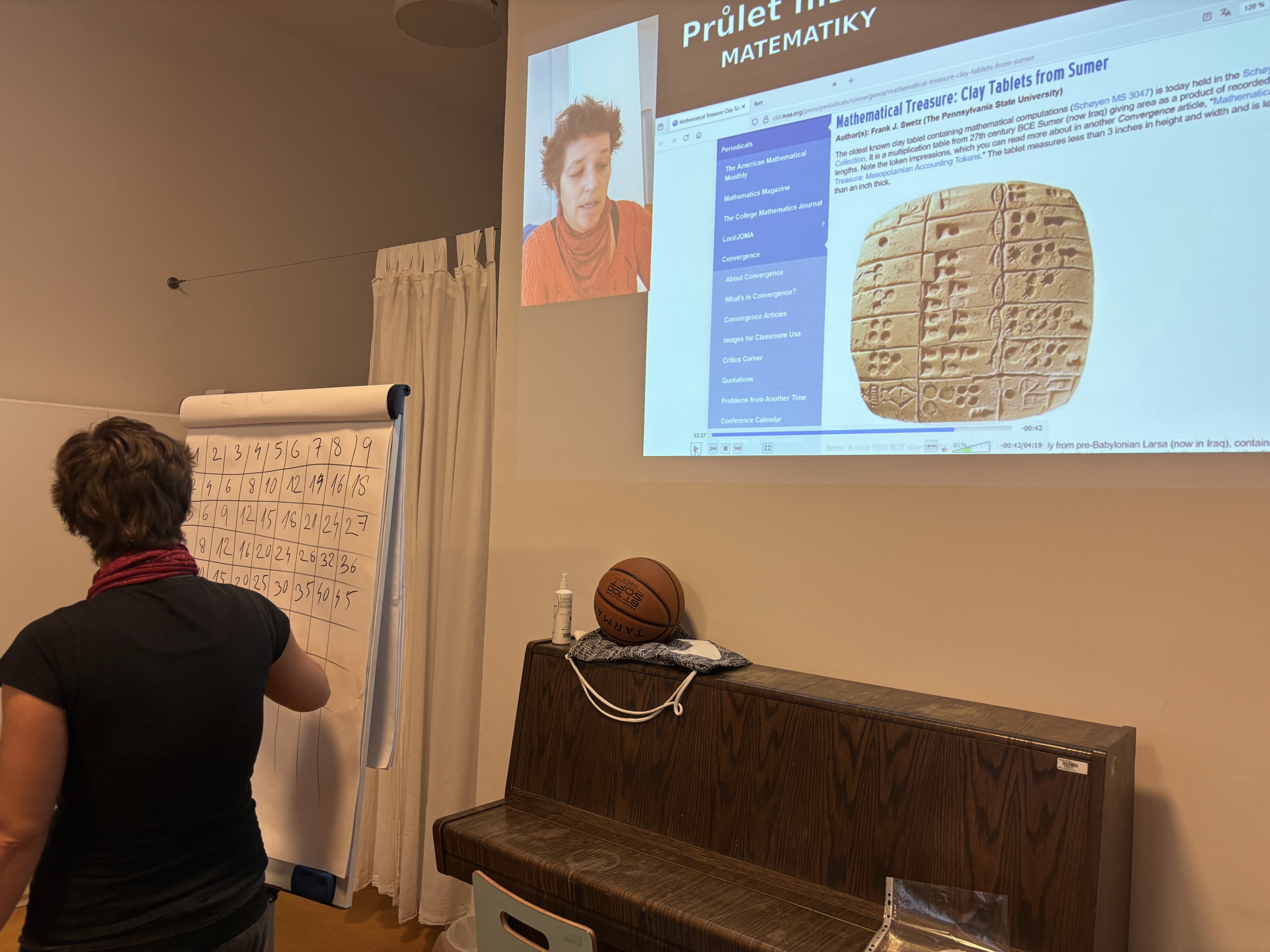 Druhá část začala prezentací počátků matematiky a počítání v dávné historii, 5 tis. let př.n.l. až do dnes, kdy se děti pokusily s pomocí AI vytvořit vlastní kalkulačku. Vše s dohledem a podporou zkušených matematiků. Musely se nejdříve „poprat“ se základními ovládacími mechanismy na PC, nahrazovat čárky písmeny a poté čísly. Vytvoření kalkulačky, užití důležitých značek a zkratek bylo cílem této části, kterou všechny děti zvládly s menšími či většími obtížemi.